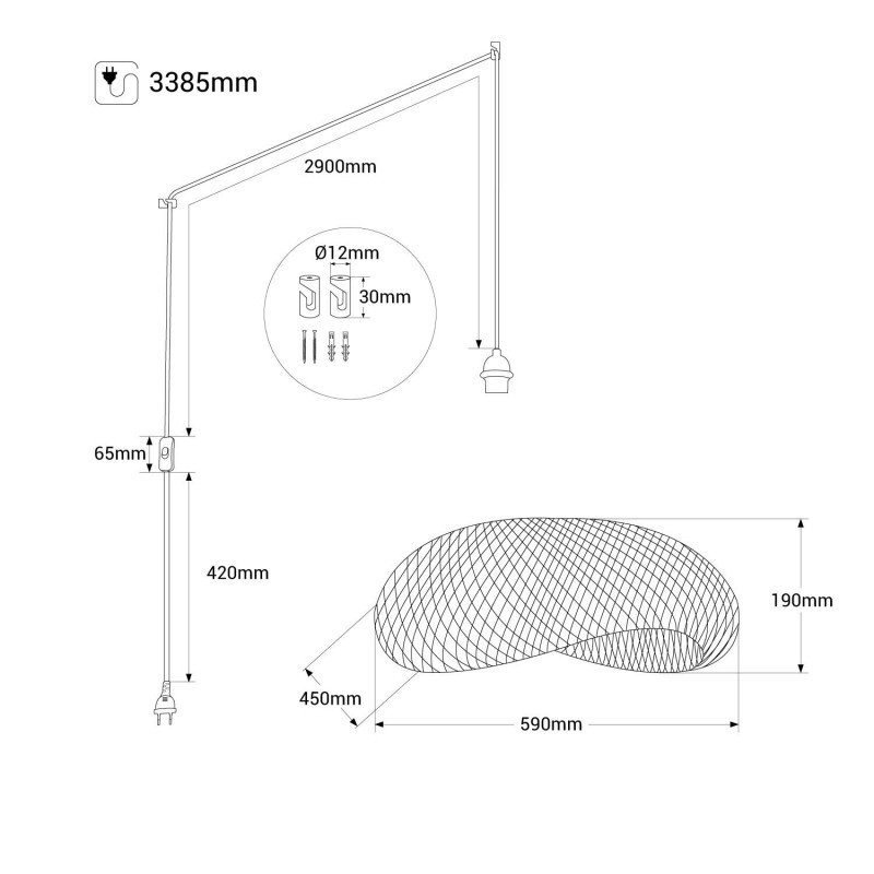 La lampe est livrée avec un câble de 3,38 mètres de long équipé d'un interrupteur, d'une prise de courant et de deux crochets de décentralisation, ce qui permet une installation et un réglage personnalisés.