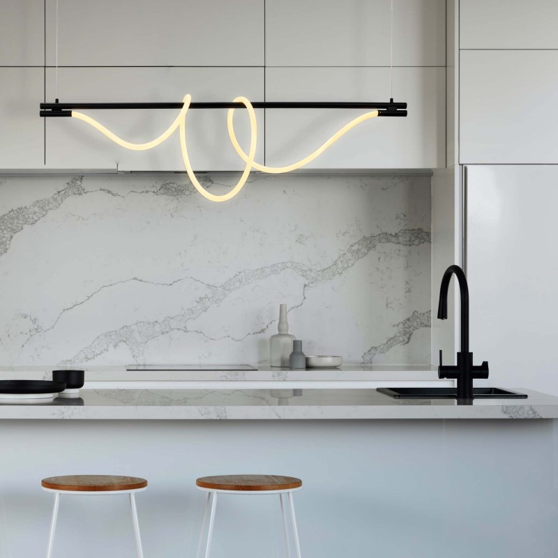 Notre lampe suspendue linéaire au design moderne et avant-gardiste est dotée d'un tuyau en néon disposé de manière enroulée. Cette lampe offre une flexibilité totale à l'utilisateur, qui peut déplacer et agencer le néon selon ses préférences.