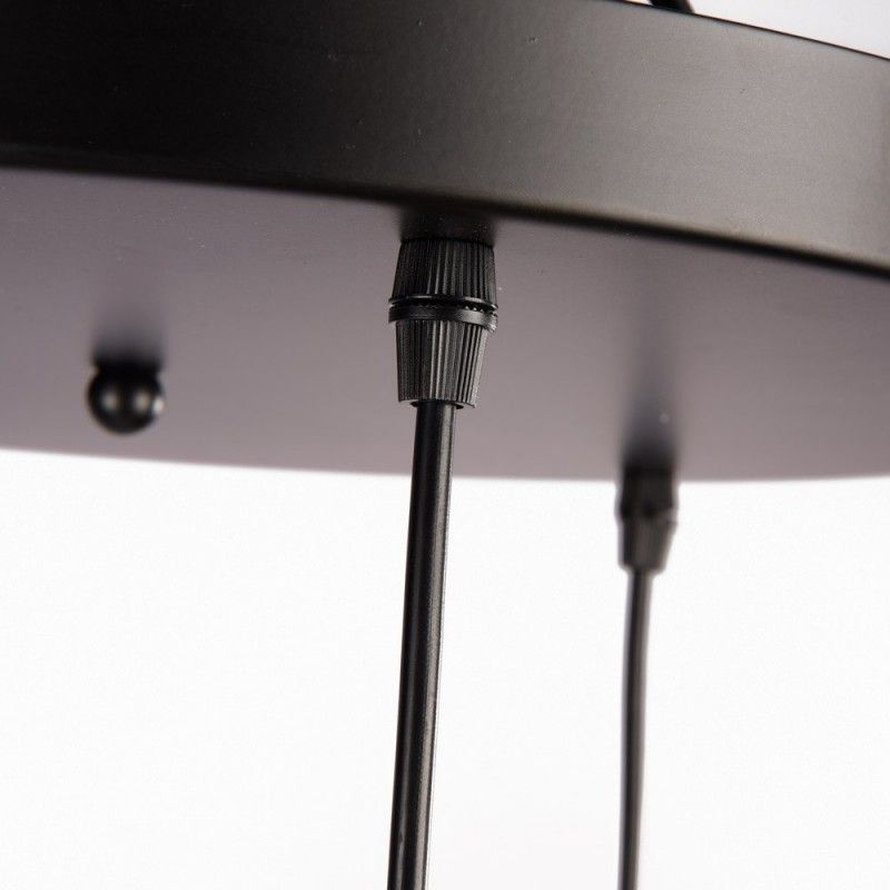 Son design original est l'élément le plus marquant de cette lampe en osier, alliant à la fois élégance et décontraction. Elle se compose de trois abat-jours suspendus à différentes hauteurs, reliés à une rosace centrale noire.