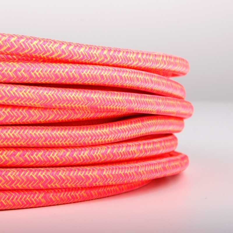 Câble électrique rond enduit d'un tissu à effet de soie en rose et jaune.
