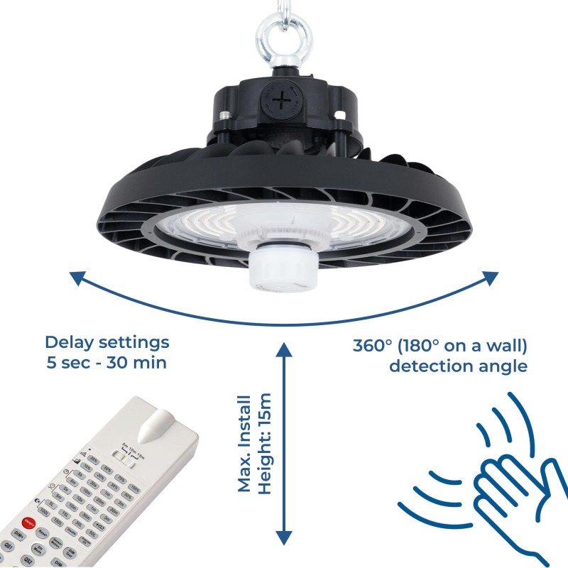 Ce détecteur de mouvement est conçu pour les environnements industriels et les entrepôts, avec une hauteur d'installation maximale de 12 mètres. Il offre des fonctions avancées qui permettent un contrôle efficace de l'éclairage.