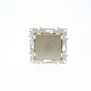 Mécanisme d'interrupteur encastrable faisant fonction de sonnette, dont la touche arbore un dessin de cloche. Design ultraplat, de dimensions standard, compatible avec un boîtier de connexion universel. Le câblage se fixe au moyen de bornes de connexion rapide, sans vis.