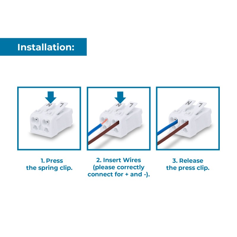 Borne de connexion rapide et sûre pour câbles de 0,5 à 2,5 mm.