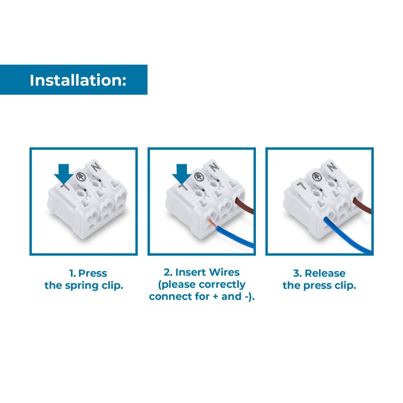Borne de connexion rapide et sûre pour câbles de 0,5 à 2,5 mm.