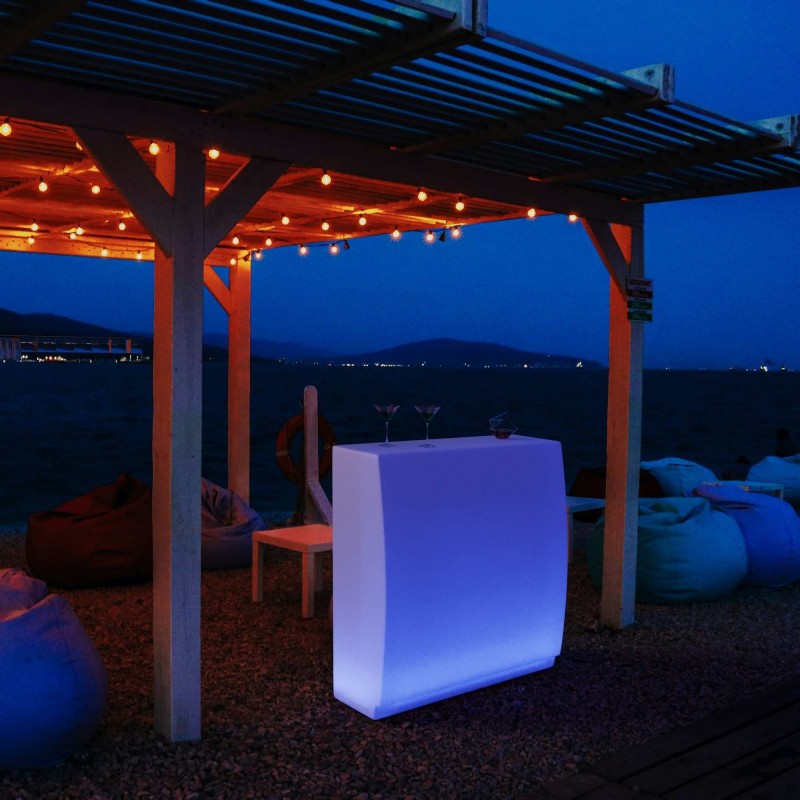 - Design multifonctionnel : idéal comme comptoir de bar, point d'accueil, présentoir d'événement ou mobilier décoratif.