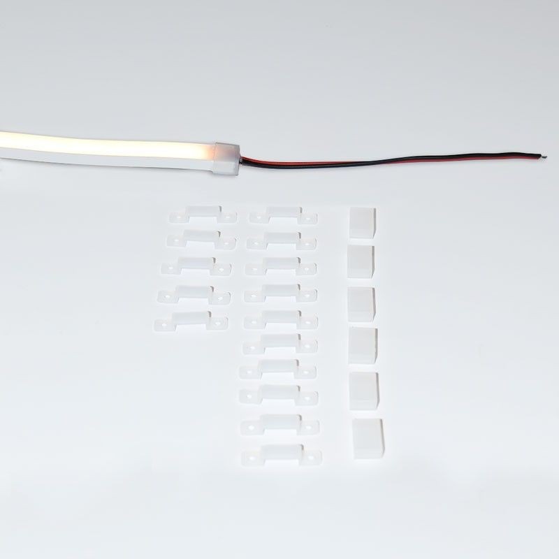 Le néon LED flexible est doté d'un couvercle en silicone avec une finition opale, assurant une dispersion de la lumière similaire aux anciens néons. Le kit d'installation inclus comprend 15 clips et 6 capuchons, permettant une mise en place facile sans besoin d'outils spéciaux.