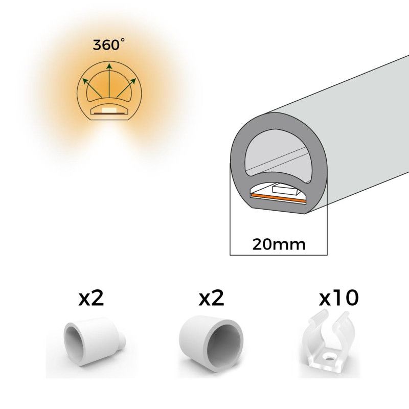 Néon LED flexible circulaire 360º - 24V DC - Ø20mm - 5 mètres - 13W/m - Kit complet - IP67
