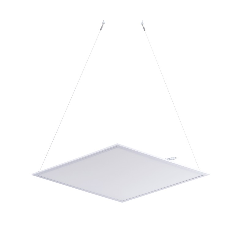 L'installation du kit se fait en fixant solidement les supports métalliques à l'arrière des panneaux LED, placés aux coins opposés. Ensuite, les ancres de plafond doivent également être positionnées, suivies par l'attachement simple des filins qui maintiennent le panneau en place. Enfin, le panneau est monté dans la cavité du faux plafond pour une intégration parfaite.
