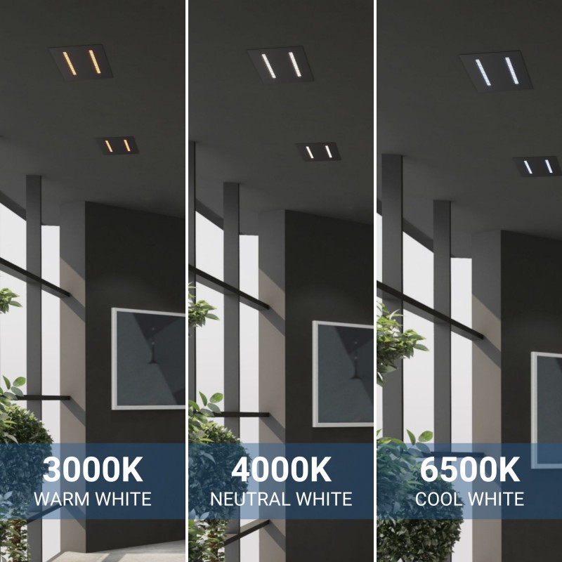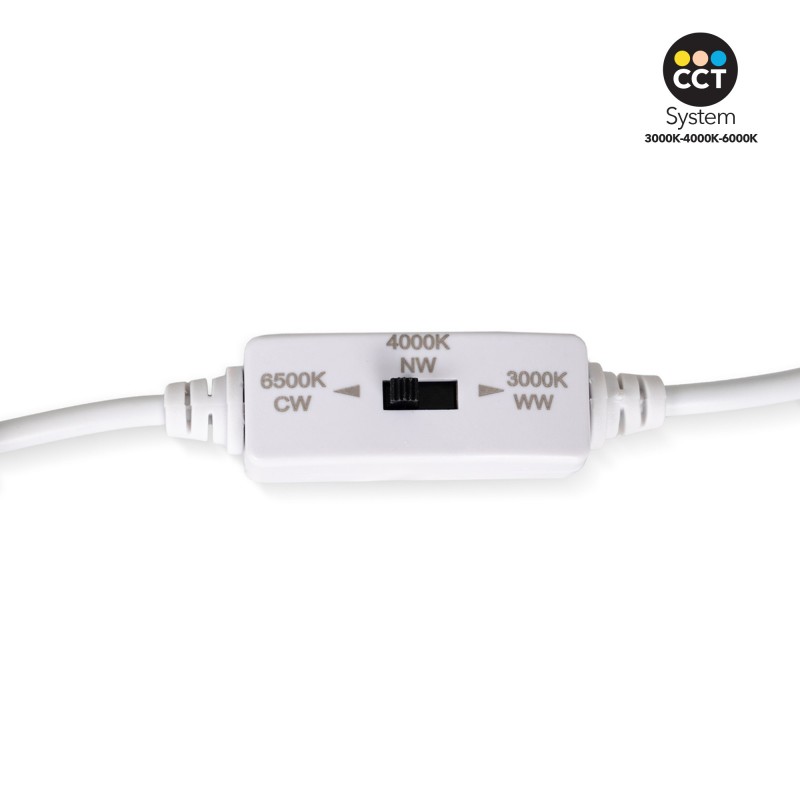 - Teinte réglable : le système CCT permet de régler la température de couleur entre : blanc chaud (3000K), blanc neutre (4000K) et blanc froid (6500K). La commande s'effectue au moyen d'un interrupteur incorporé dans le panneau.