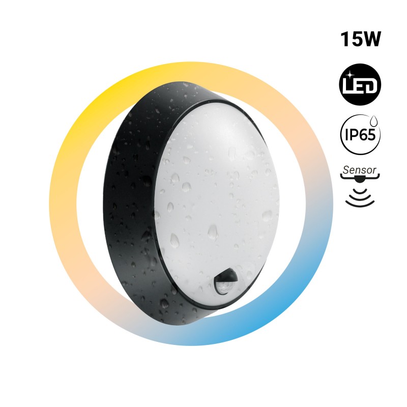 Plafonnier LED extérieur rond avec capteur PIR - 15W - CCT - IP65