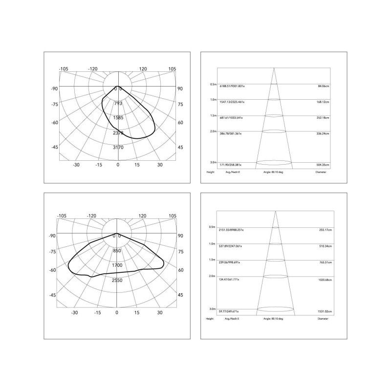 - Lentille asymétrique : optimise la distribution de la lumière à partir d'emplacements élevés, en fournissant un faisceau focalisé dirigé vers le sol, avec moins d'éblouissement et de pollution lumineuse que les projecteurs symétriques.