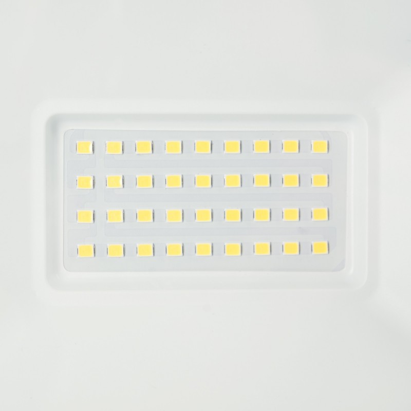 Projecteur LED 30W au design compact, avec un boîtier métallique blanc et un diffuseur en verre.