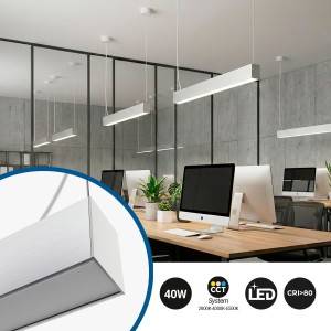 Suspension linéaire LED au design moderne, idéale pour les bureaux, les magasins et les espaces de travail nécessitant un éclairage professionnel, efficace et offrant un confort visuel optimal.