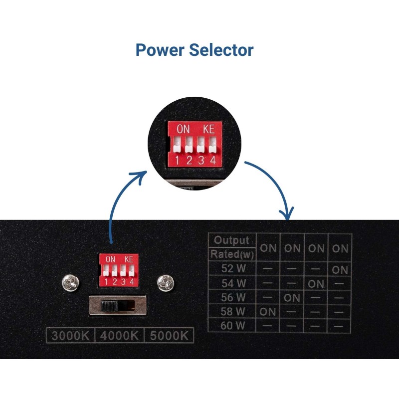 • Puissance réglable : Un dip switch intégré permet de sélectionner différentes puissances, s’adaptant à l’intensité lumineuse requise.