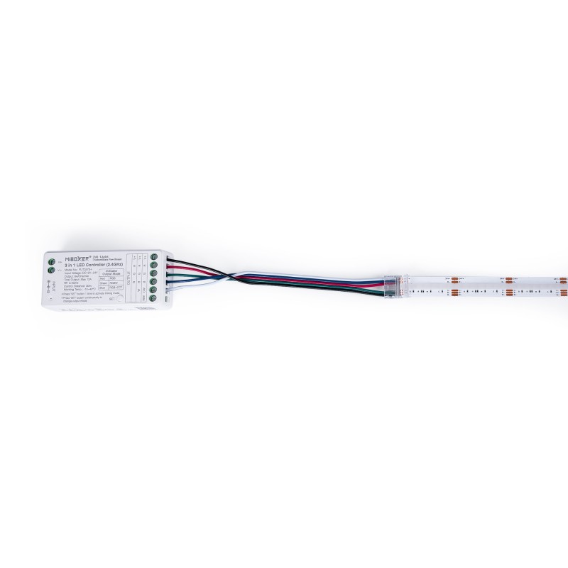 Ce connecteur convient à tous les rubans LED RGBW COB IP20 avec un circuit imprimé de 12 mm de large et une tension maximale de 24 V.