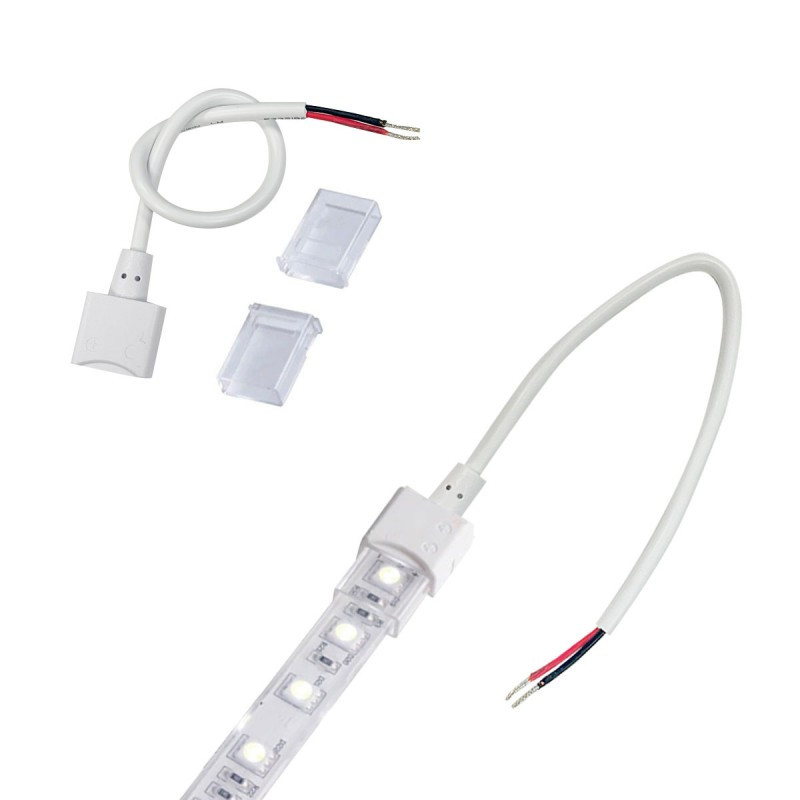 Il permet de relier une bande LED SMD étanche de 10 mm de large (12 mm si l'on tient compte du revêtement en silicone) à un câble d'alimentation.