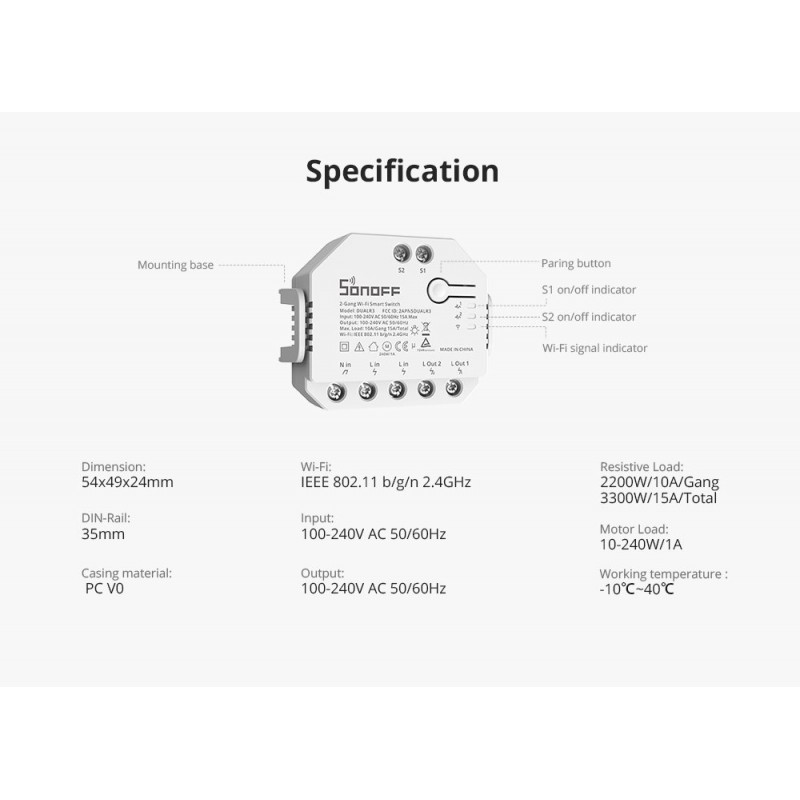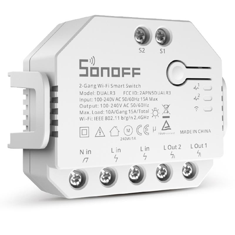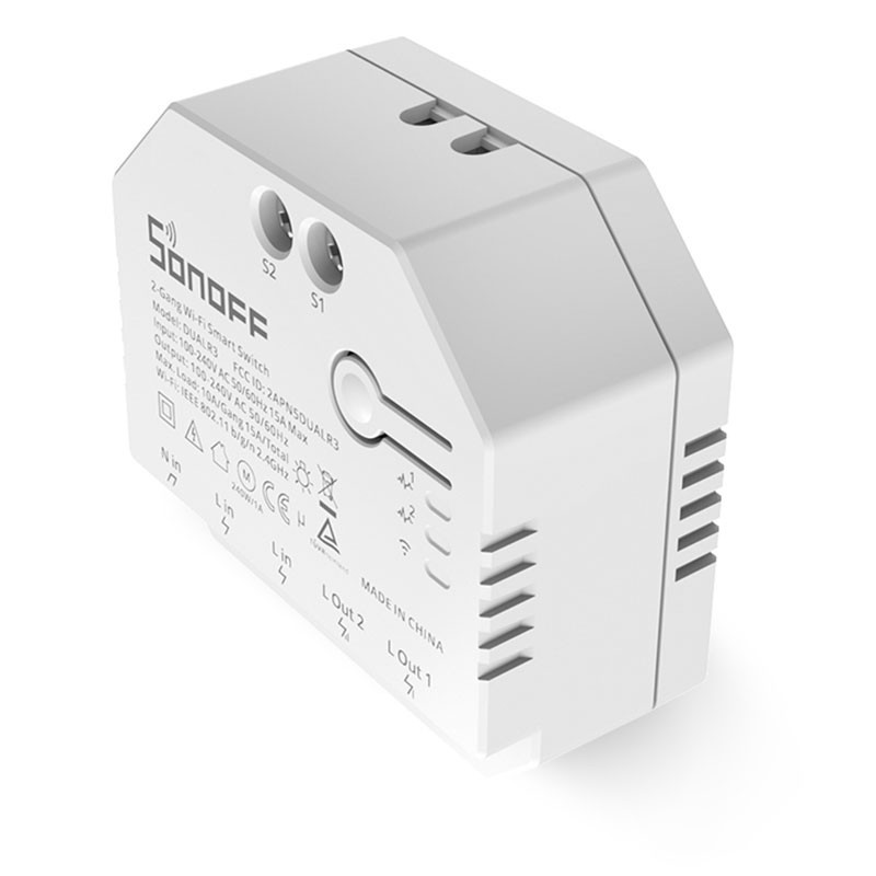 Le sonoff dual R3 permet le contrôle bidirectionnel de deux appareils respectivement. Pour des puissances de 100-240V. Haute qualité et fiabilité.