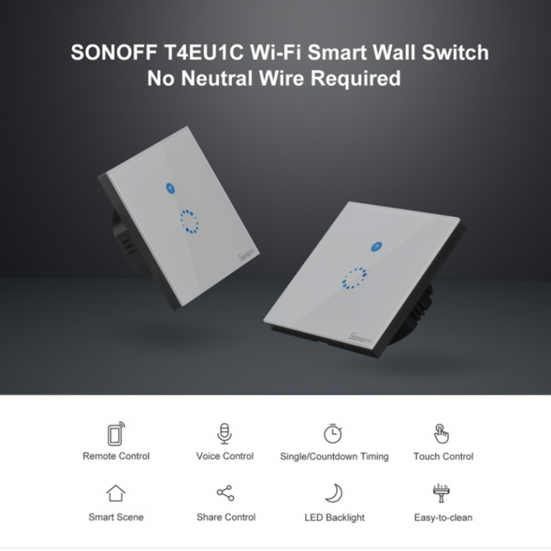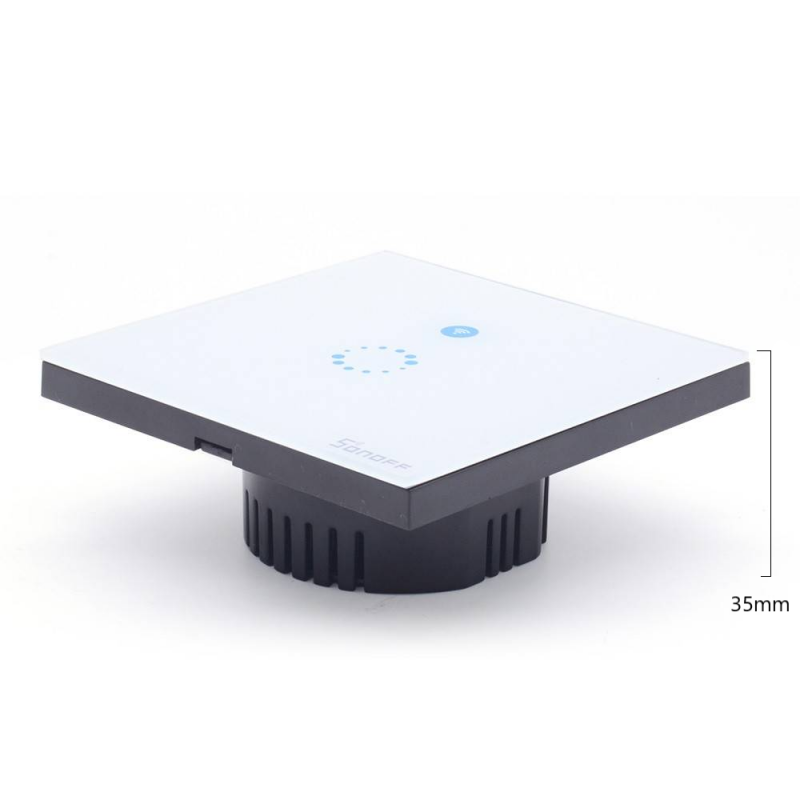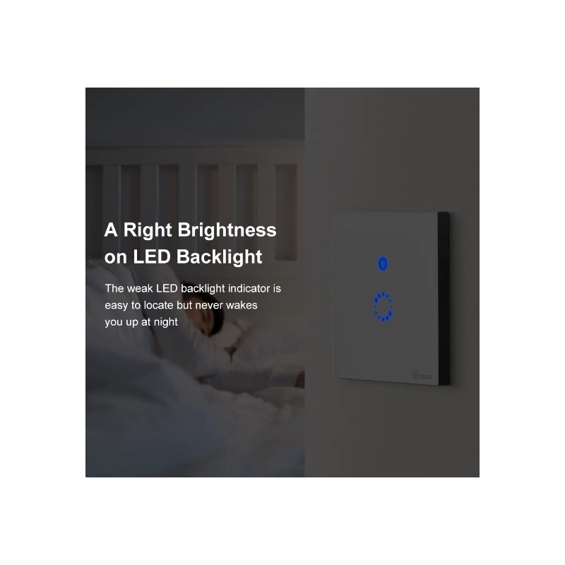 L'interrupteur mural SONOFF TOUCH est un dispositif à commande tactile permettant de contrôler (éteindre/allumer) les luminaires et dispositifs branchés sur un même circuit électrique. Élégant et discret avec sa finition design en verre de qualité supérieure, il est compatible avec les dispositifs fonctionnant sous iOS/Android, et permet de contrôler vos luminaires à distance via l'application eWeLink.