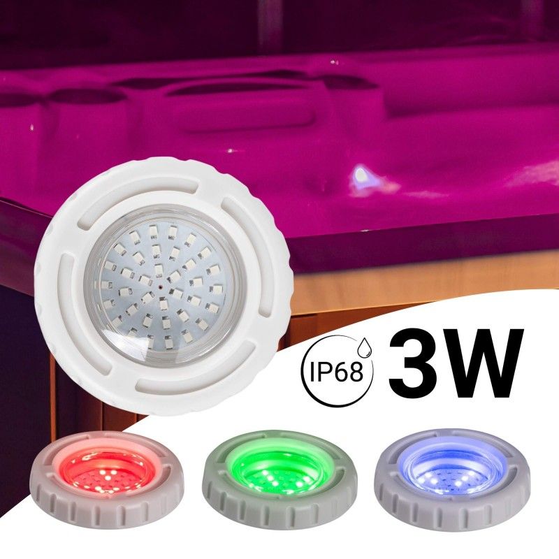 Spot LED submersible de 3W avec montage en surface et protection IP68, idéal pour éclairer et embellir les petites piscines, les jacuzzis et les fontaines avec efficacité et sécurité.