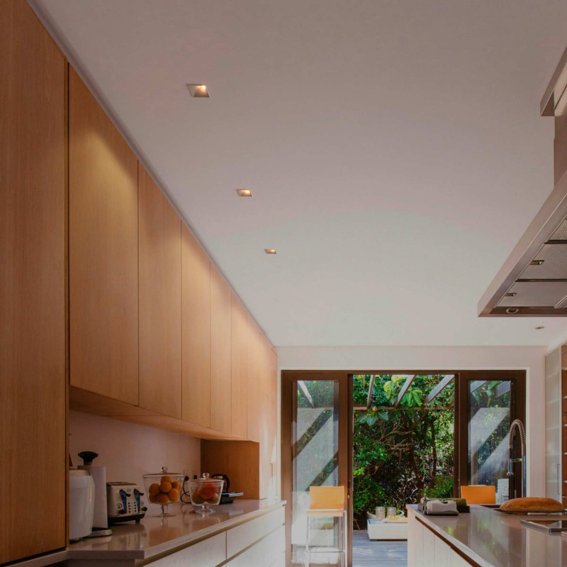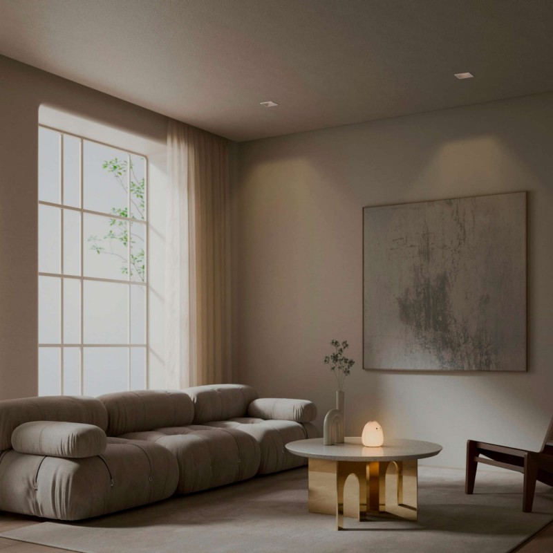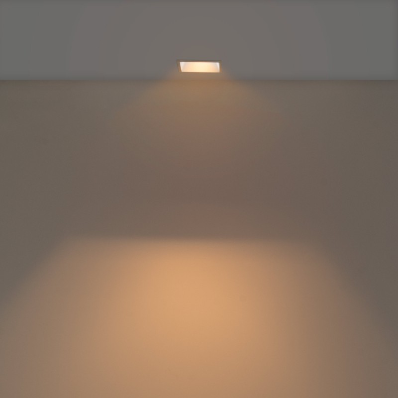 Collerette d'encastrement carrée avec éclairage asymétrique.
