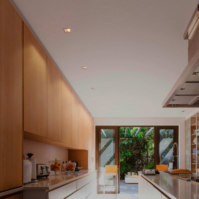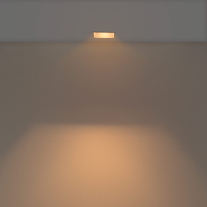 Collerette d'encastrement carrée avec éclairage asymétrique.