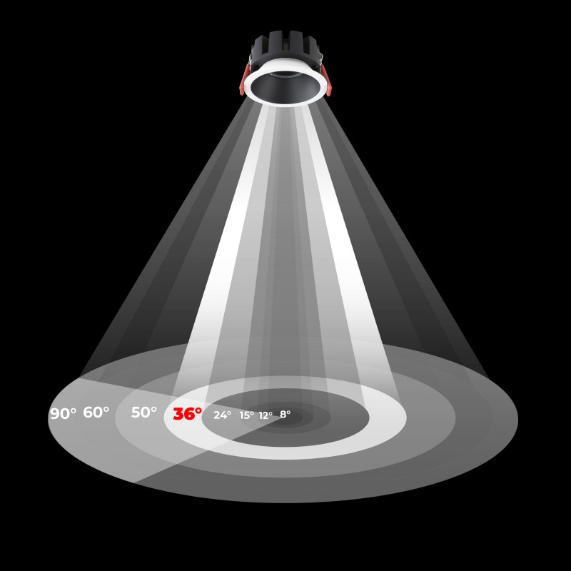 - Angle d'ouverture de 36° : fournit un éclairage ciblé, idéal pour mettre en valeur des objets ou des zones spécifiques.