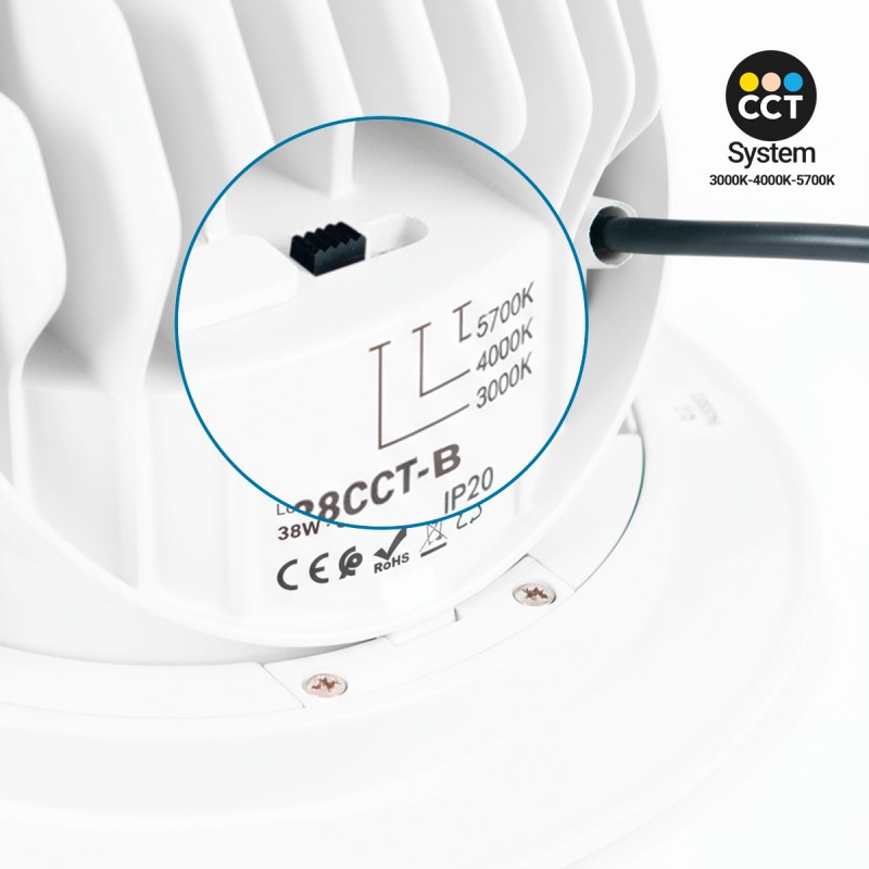 Particulièrement recommandé pour un usage commercial, avec une puissance de 38W et un système CCT qui permet de sélectionner la température entre le blanc chaud (3000K), le blanc neutre (4000K) et le blanc froid (5700K).