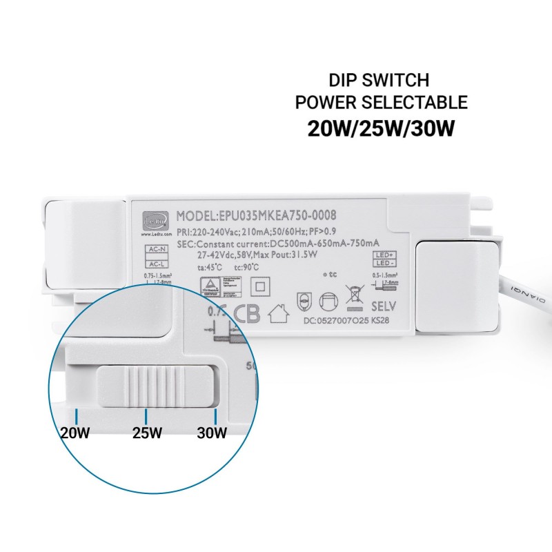 - Puissance réglable : avec interrupteur DIP intégré, qui vous permet de sélectionner la puissance entre 20W, 25W et 30W, s'adaptant ainsi parfaitement à chaque environnement.