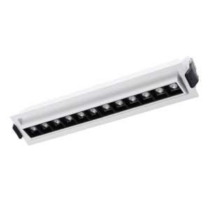Le luminaire LED linéaire encastrable est constitué de 12 spots d'une puissance totale de 20W. Chaque spot est équipé de puces LED Osram et produit une lumière ponctuelle avec un angle de diffusion de 24º. Cette lumière est d'une tonalité blanc chaud (2800K).