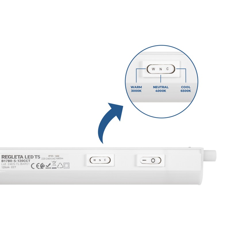 - Teinte réglable : avec un système CCT qui permet, grâce à un sélecteur, de choisir entre trois températures de couleur : blanc chaud (3000K), neutre (4000K) et froid (6500K).
