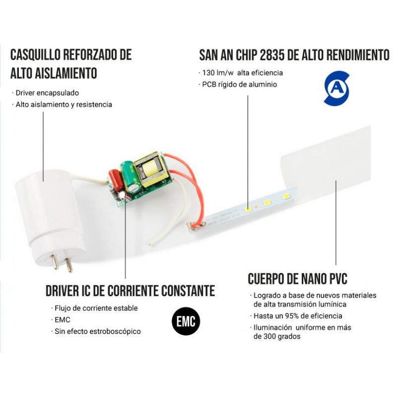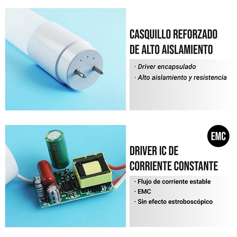 Avec un rendement lumineux de 140 lumens/W, il s'agit de l'un des tubes LED les plus efficaces actuellement sur le marché. Il intègre un driver de haute qualité spécialement conçu pour éviter tout scintillement et dispose d'un filtre EMC, éliminant les interférences avec d'autres appareils tels que radios, wifi, ou dispositifs de musique diffusée par système audio.